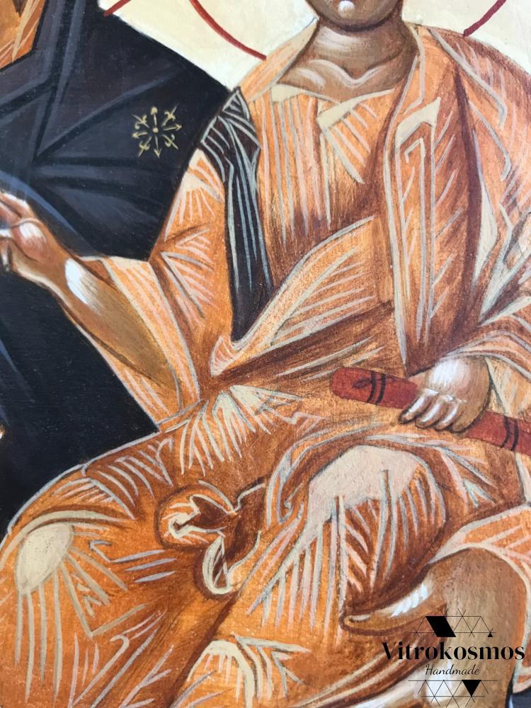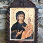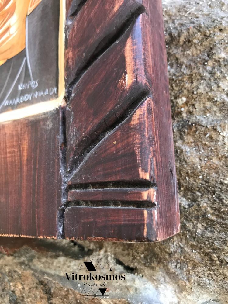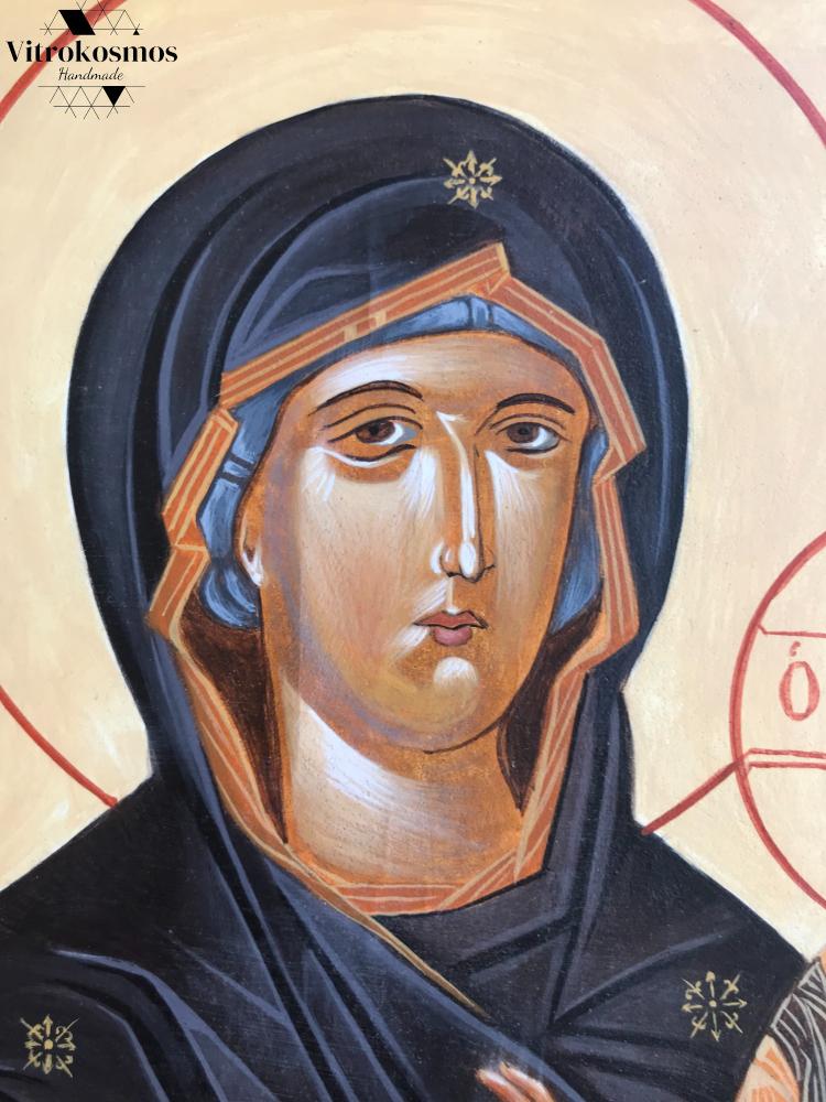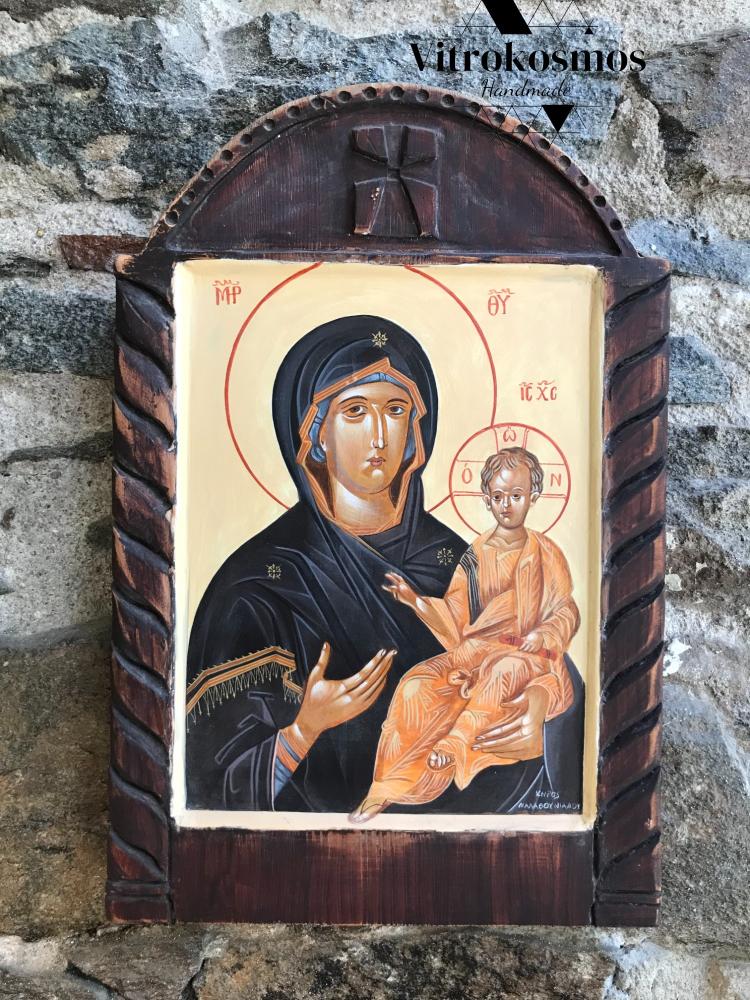 Χειροποίητη εικόνα της Παναγία Οδηγήτρια με τον Χριστό, φιλοτεχνημένη με την τεχνική της βυζαντινής αγιογραφίας, πάνω σε σκαλισμένο και ειδικά επεξεργασμένο ξύλο.