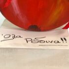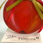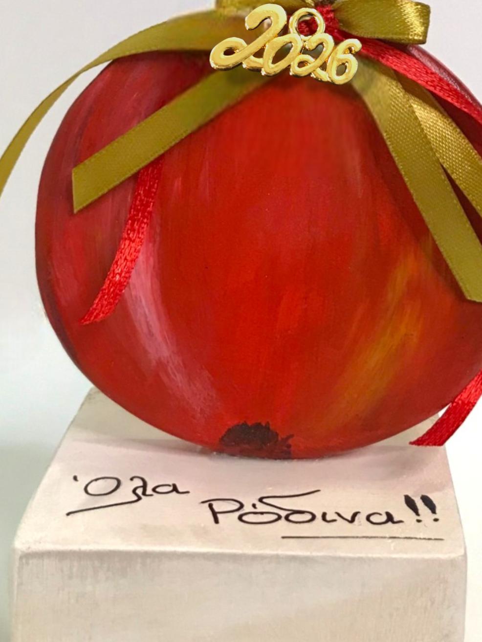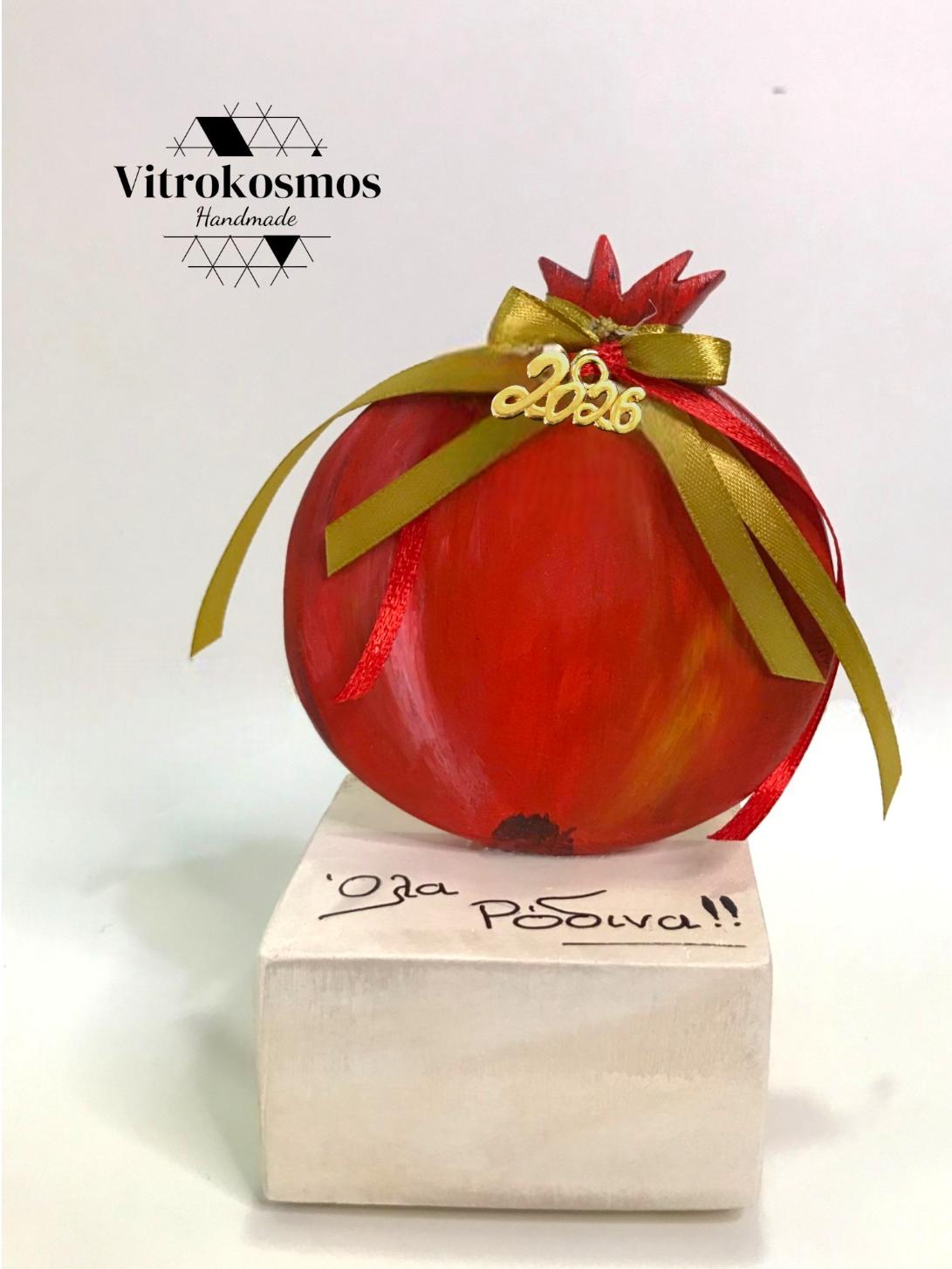 Χειροποίητο ρόδι από πηλό σε έντονο κόκκινο, διακοσμημένο με γιορτινές κορδέλες σε χρυσό και κόκκινο και μεταλλικό στοιχείο “2026”. Τοποθετημένο σε ξύλινο κύβο, είναι γούρι που φέρνει καλοτυχία, υγεία και αφθονία για το νέο έτος.