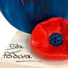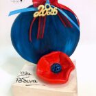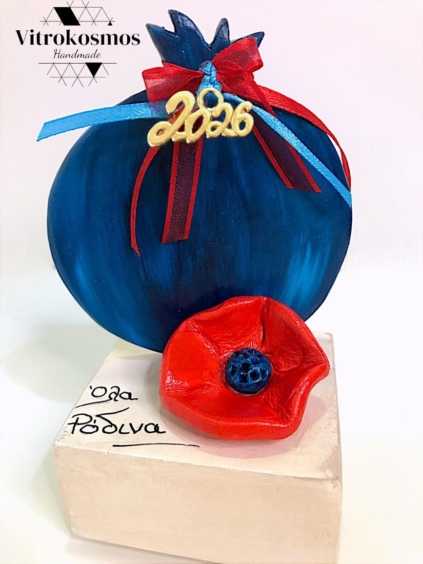 Χειροποίητο ρόδι από πηλό, βαμμένο σε βαθύ μπλε και διακοσμημένο με κόκκινη παπαρούνα, δεμένο με γιορτινές κορδέλες. Το 2026 ξεχωρίζει σε χρυσή λεπτομέρεια, φέρνοντας μαζί του ευχές για υγεία, τύχη και αφθονία. Τοποθετημένο πάνω σε ξύλινο κύβο, αποτελεί ένα ιδιαίτερο γούρι και ταυτόχρονα διακοσμητικό στοιχείο για κάθε σπίτι.