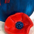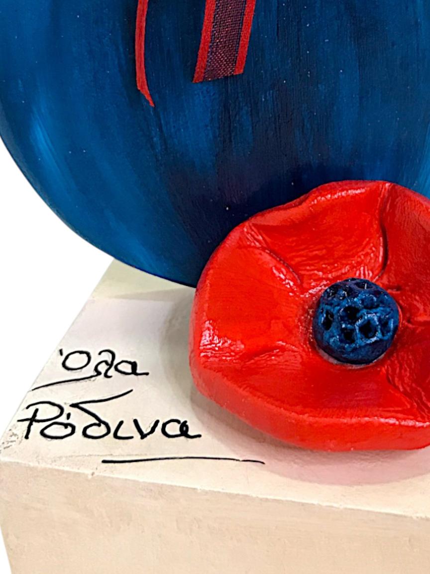Χειροποίητο ρόδι από πηλό σε βαθύ μπλε, διακοσμημένο με παπαρούνα επίσης από πηλό και γιορτινές κορδέλες. Τοποθετημένο σε ξύλινο κύβο, αποτελεί γούρι για το 2026 που φέρνει τύχη, υγεία και αφθονία.