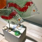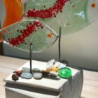 Το γυαλί στηρίζεται σε ξύλινο κύβο, επεξεργασμένο στο χέρι από τον δημιουργό, ενώ η σύνθεση συμπληρώνεται με φυσικά στοιχεία, όπως βότσαλο και γυάλινη χάντρα.