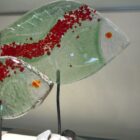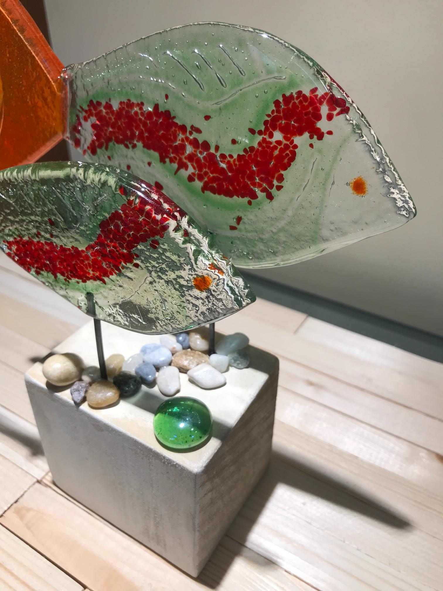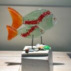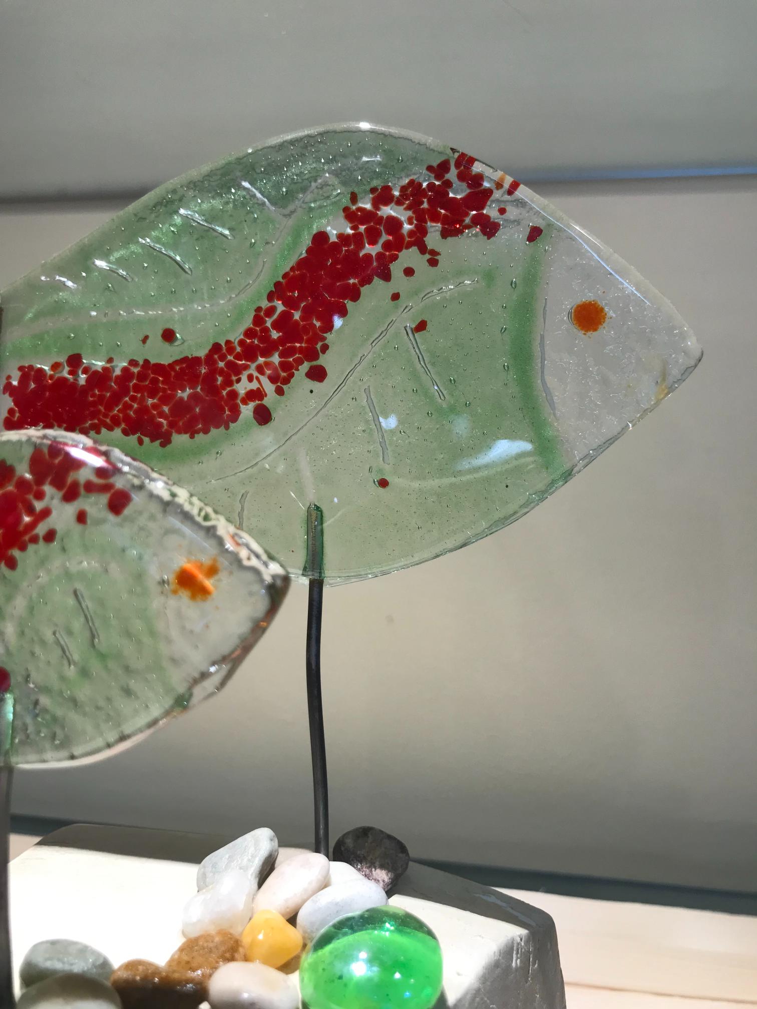 Αυτό το χειροποίητο γλυπτό αποτελείται από fusing γυαλί, διαμορφωμένο έτσι ώστε να απεικονίζει δύο ψαράκια, δημιουργώντας μια αίσθηση κίνησης και αρμονίας.