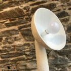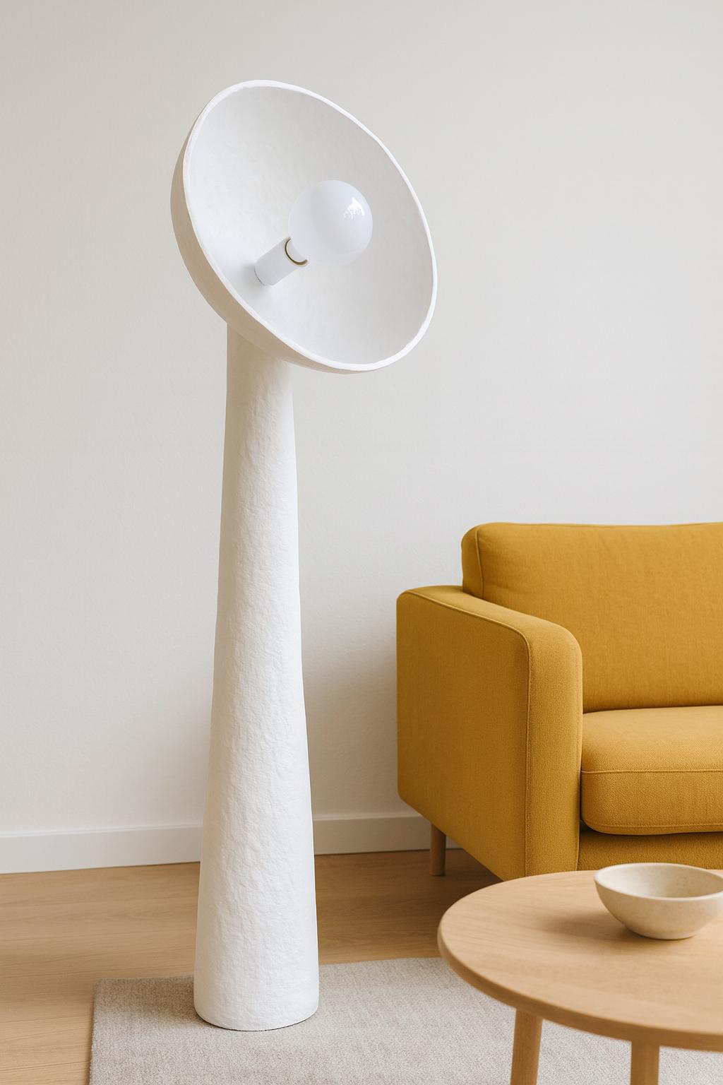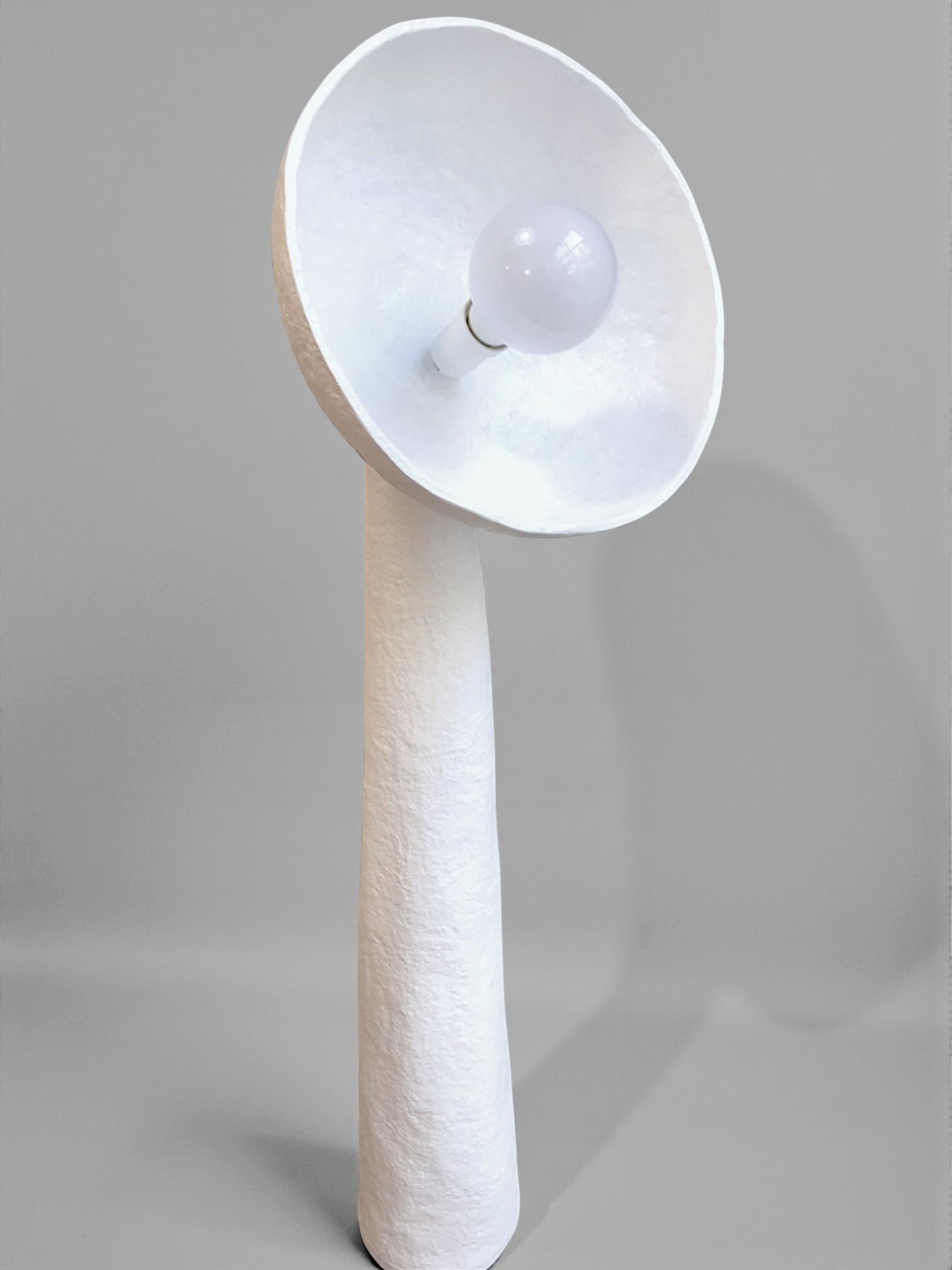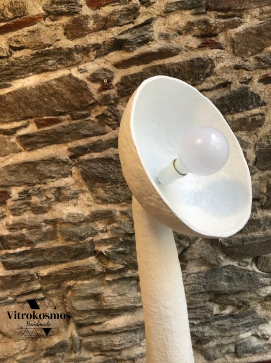 Χειροποίητο επιδαπέδιο φωτιστικό από papier mâché, σε λευκή απόχρωση με γλυπτική φόρμα.