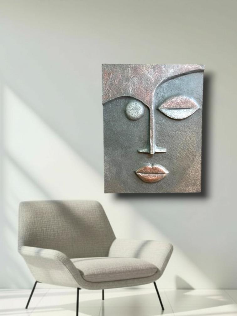 Χειροποίητος πίνακας από papier-mâché με αφαιρετικό πρόσωπο και ανάγλυφες λεπτομέρειες. Κομψό, σύγχρονο έργο με γήινες μεταλλικές αποχρώσεις. Κάθε κομμάτι μοναδικό.