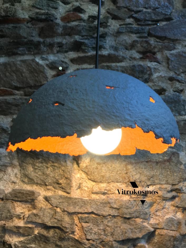 Το Stella είναι ένα μοναδικό χειροποίητο φωτιστικό οροφής από papier mâché, που μαγνητίζει με την απλότητά του και τον καλλιτεχνικό του χαρακτήρα. Ο ημισφαιρικός θόλος με τις διάτρητες λεπτομέρειες αφήνει το φως να ξεφεύγει σαν μικρές αστραπές, δημιουργώντας ατμόσφαιρα γεμάτη ζεστασιά και μυστήριο. Η γκρι επιφάνειά του με την πορτοκαλί λεπτομέρεια στην κορυφή προσθέτει μια μοντέρνα πινελιά. Ιδανικό για σαλόνι, τραπεζαρία ή χώρους που χρειάζονται μια ξεχωριστή καλλιτεχνική αίσθηση.