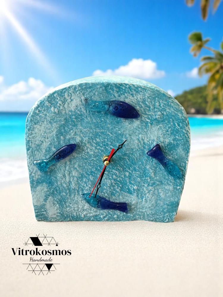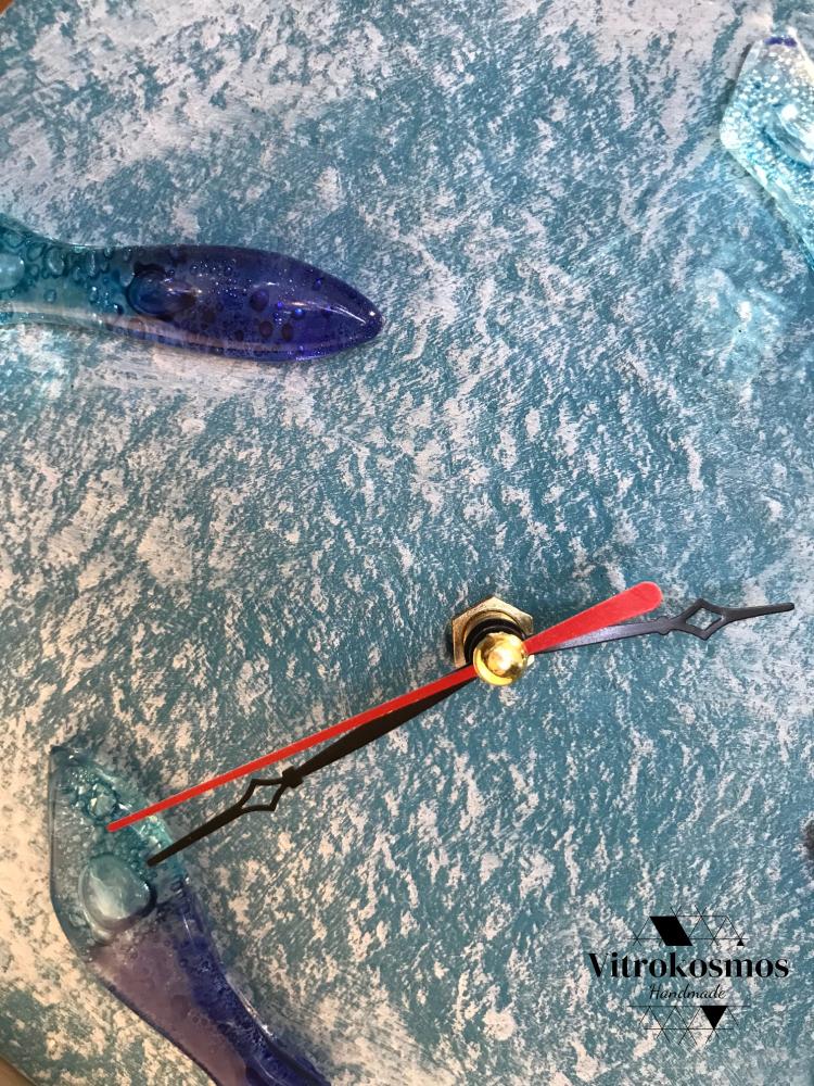Οι μαύροι δείκτες με τον κόκκινο δείκτη δευτερολέπτων προσθέτουν έντονη αντίθεση, ολοκληρώνοντας ένα διακοσμητικό αντικείμενο που λειτουργεί ταυτόχρονα ως ρολόι και ως μικρό θαλασσινό γλυπτό.