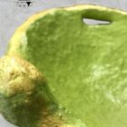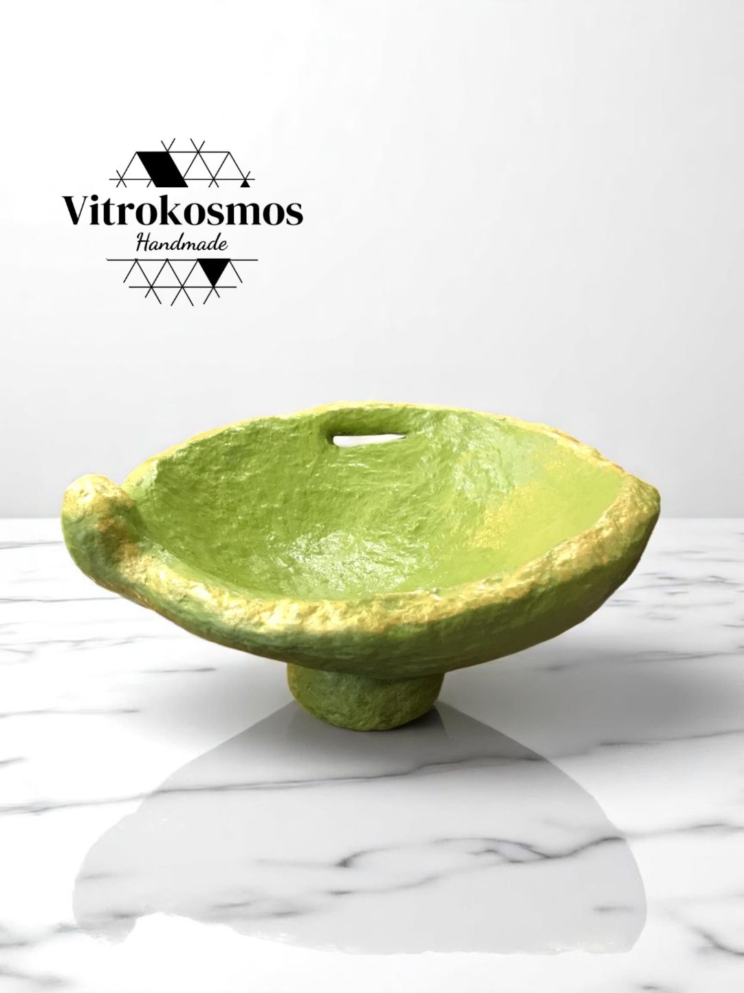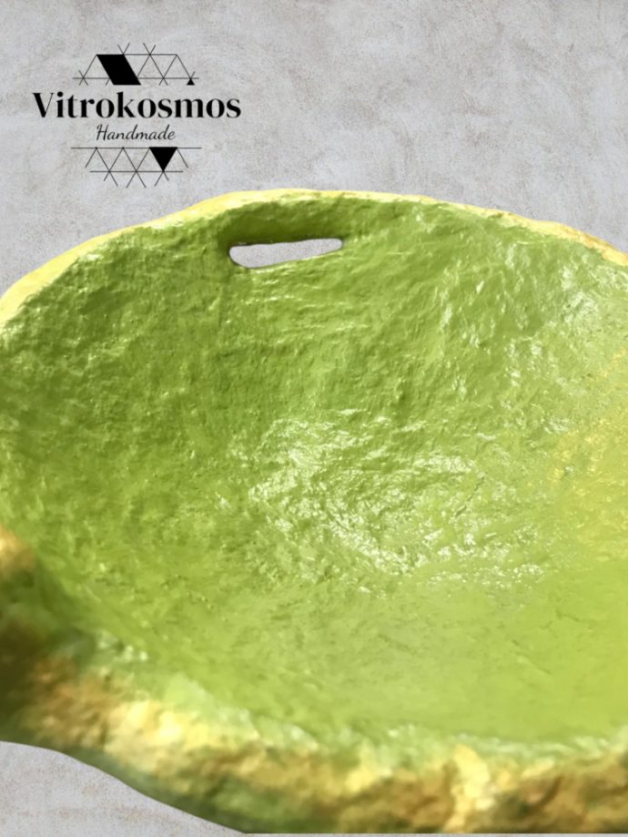 Χειροποίητο μπολ από papier mâché σε πράσινη απόχρωση με χρυσές λεπτομέρειες, ιδανικό για καλλιτεχνική διακόσμηση.